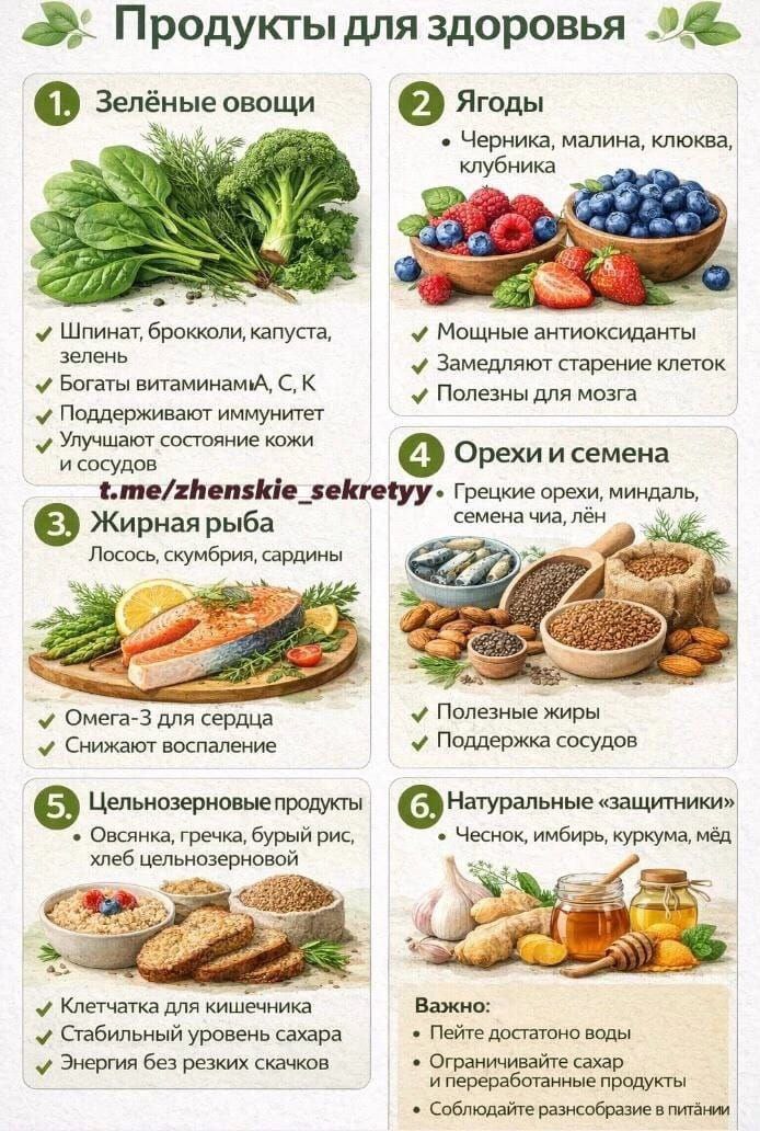 Чтобы сохранить здоровье на долгие годы, важно регулярно включать в рацион продукты, которые поддерживают сердце, сосуды, иммунитет и обмен веществ 💚