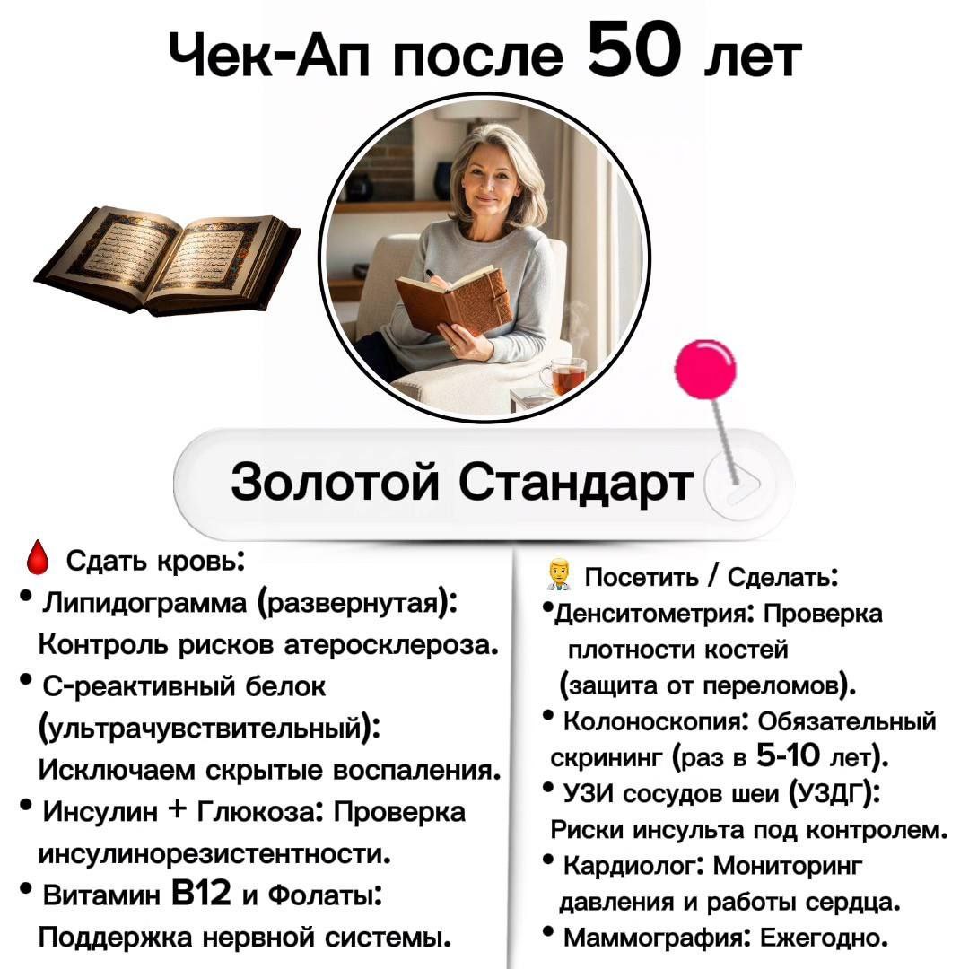 1⃣ Проходишь чекап 50+ (подробный список на картинке)