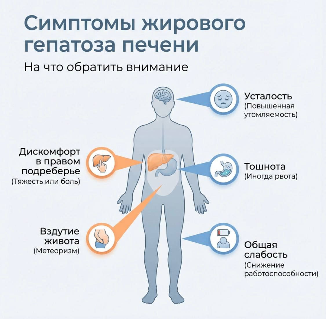 Некоторые возможные признаки: https://probolezny.ru/zhirovoy-gepatoz-nealkogolnaya-zhirovaya-bolezn-pecheni/